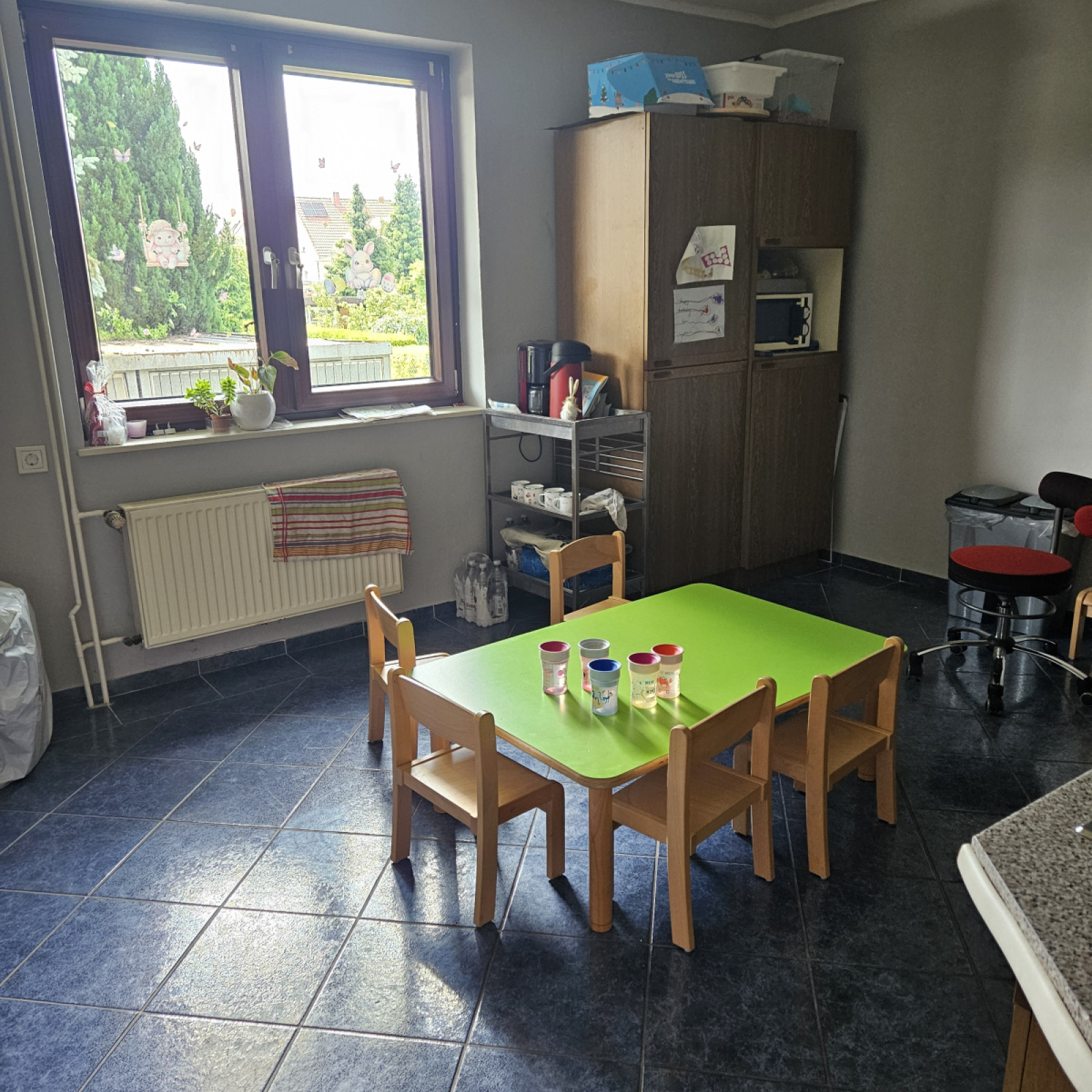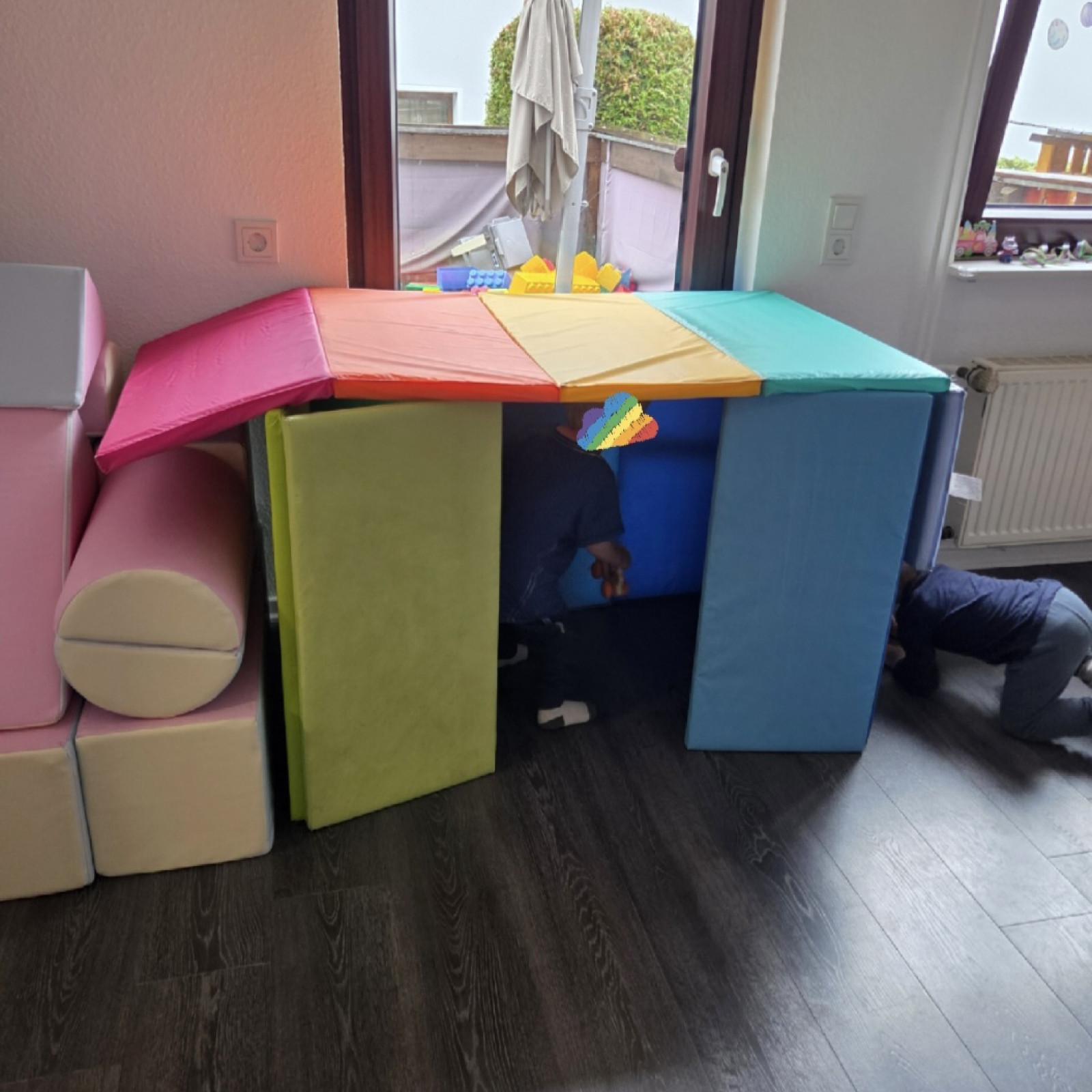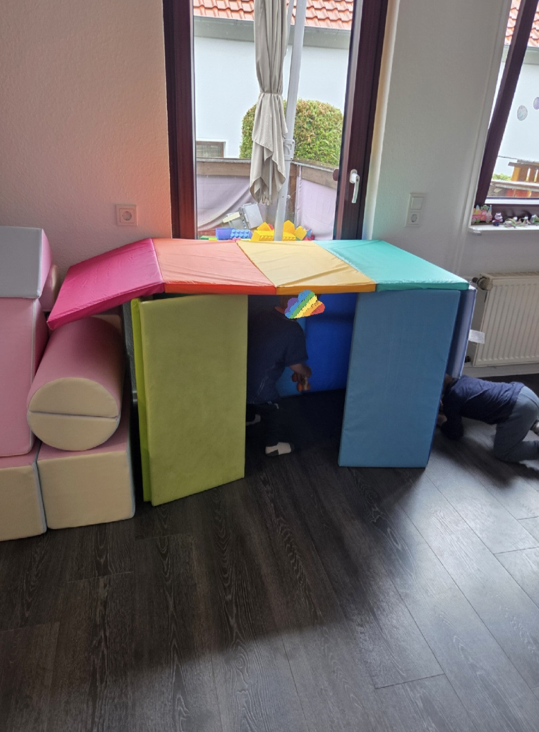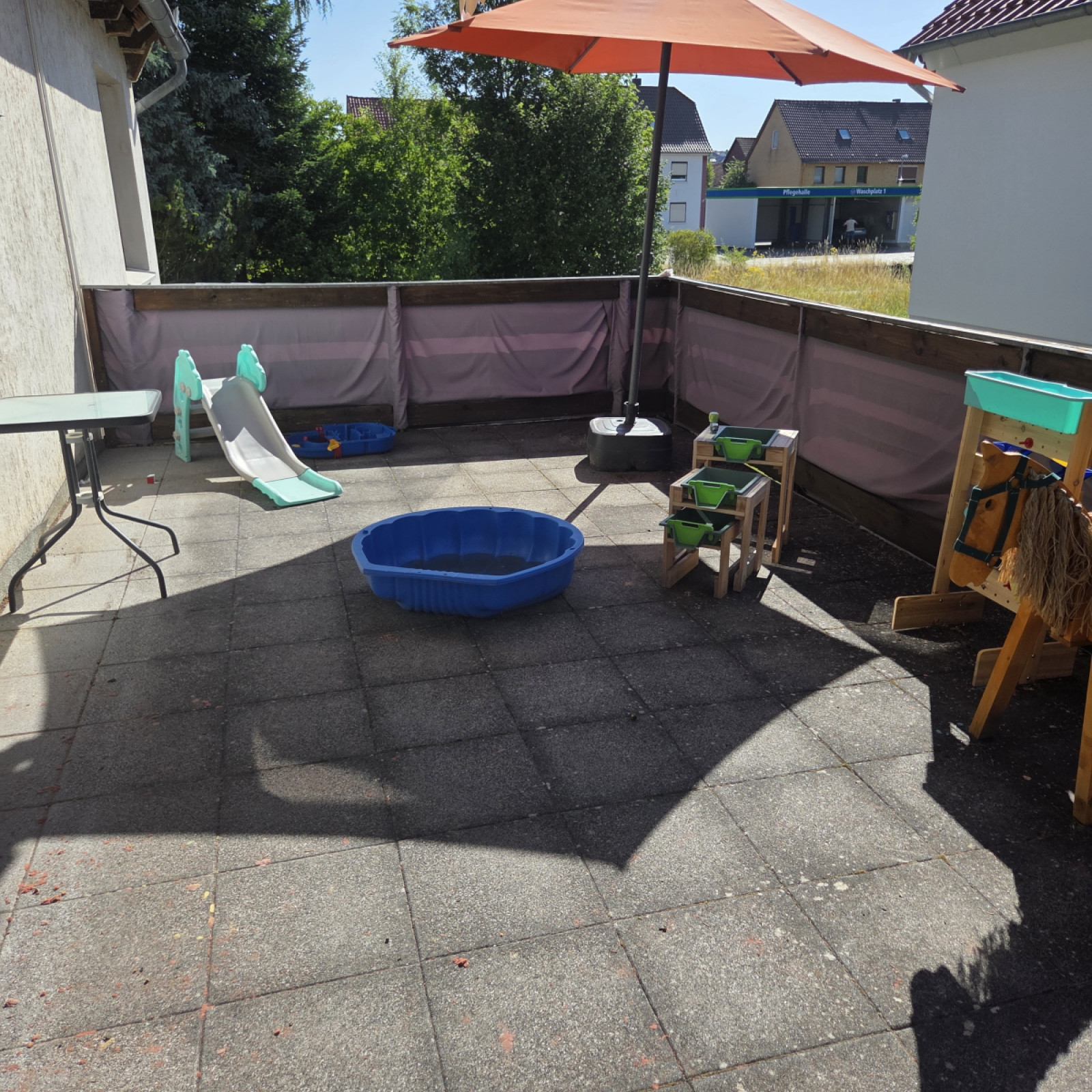 Zu der Kindertagespflege gehört auch noch die schöne Terrasse, wo wir uns an heißen Tagen aufhalten. So kann jedes Kind selber entscheiden ob es draußen oder lieber drinnen spielen möchte.