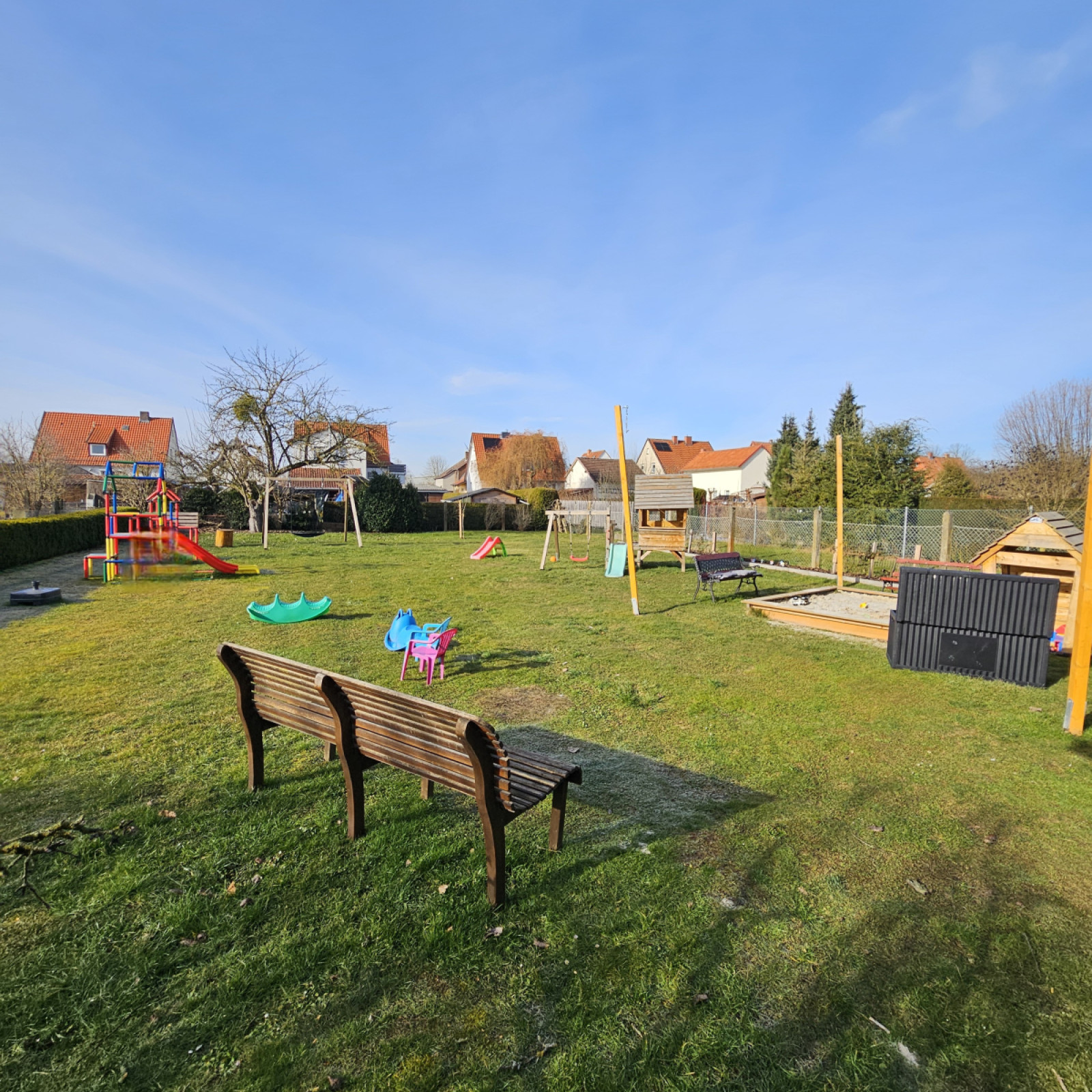 Der große Garten ist altersentsprechend und liebevoll gestaltet. Es gibt auch hier Klettergeräte, Schaukeln, viele verschiedene Fahrzeuge und einen großen Sandkasten. Die Spielräume laden zu vielen Rollenspiele ein.